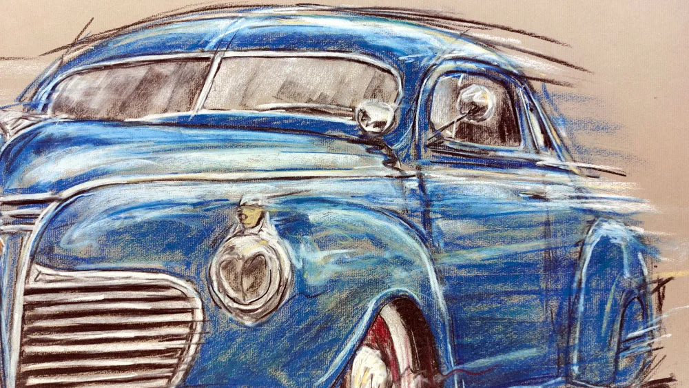 Es ist ein bewusster Bruch mit den Erwartungen. Während der echte Plymouth früher laut, schwer und aus massivem Stahl war, zeigt ihn die Pastellzeichnung von seiner weichen, fast träumerischen Seite. Die sanften Farbübergänge der Kreide fangen das Licht auf den Kotflügeln so ein, wie es kein Foto könnte.